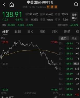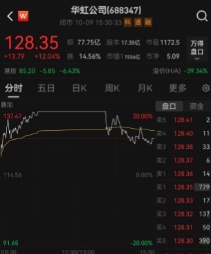 10月9日午后一点半,A股半导体板块风雨突变,中芯国际股价突然震荡下行,中芯国际港股走势则更加奔放,直接由涨转跌,一度跌超7%,港股华虹半导体也渐渐下行,由涨9%反跌8%。随后,原本封住“20cm”涨停的华虹公司炸板,股价震荡下行,中芯国际A股也从9%的涨幅一路翻绿,截至收盘,华虹公司报128.35元/股,上涨12.04%,中芯国际报138.91元/股,下跌0.87%,二者均留下长长的上影线。