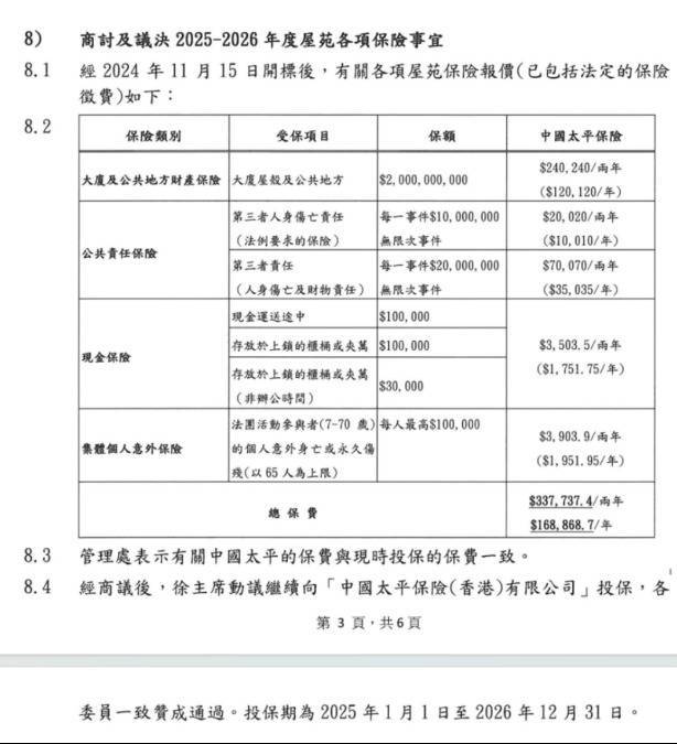 其中,大厦及公共地方财产保险保额为20亿港元,对应保费为24.02万元/两年,受保项目为大厦房屋及公共地方;
